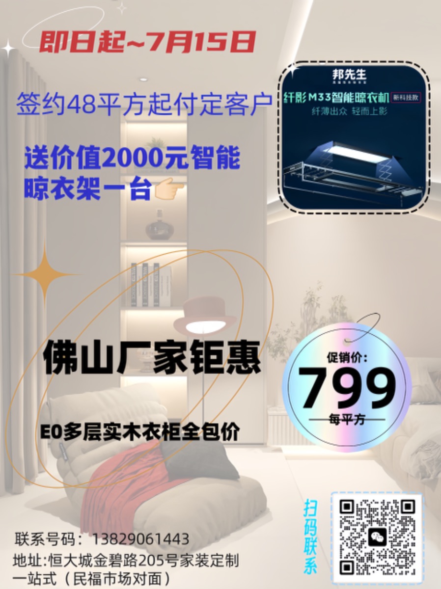 正文摘要:即日起到7月15號,凡下單48平方起,付定的客戶, 送價值兩千元智能晾衣架一臺! 衣柜定制E0實木多層板,PUR封板,佛山大廠生產(chǎn) 只要799 元/平方全包 歡迎咨詢選購 |