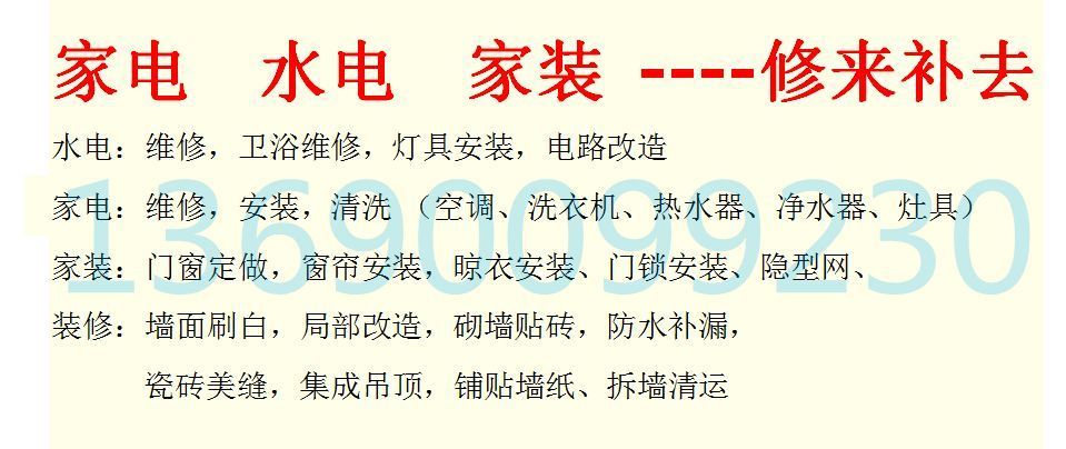 隔墻、刷墻、二手翻新、店面改造、辦公水電 13690099230 老房改造 店面改造 13690099230[color=rgba(0, 0, 0, 0.85)]家裝修修補補找13690099230[color=rgba(0, 0, 0, 0.85)] 房子修補翻新-水電改造-門窗更換-窗簾燈具換新-油漆粉刷 小區(qū)精裝房改裝陽臺、廁所、背景墻、美縫、隱形網、門窗拆除重做、粉刷、修補等 吊頂隔斷、補漏修補、粉刷油漆、貼磚 |